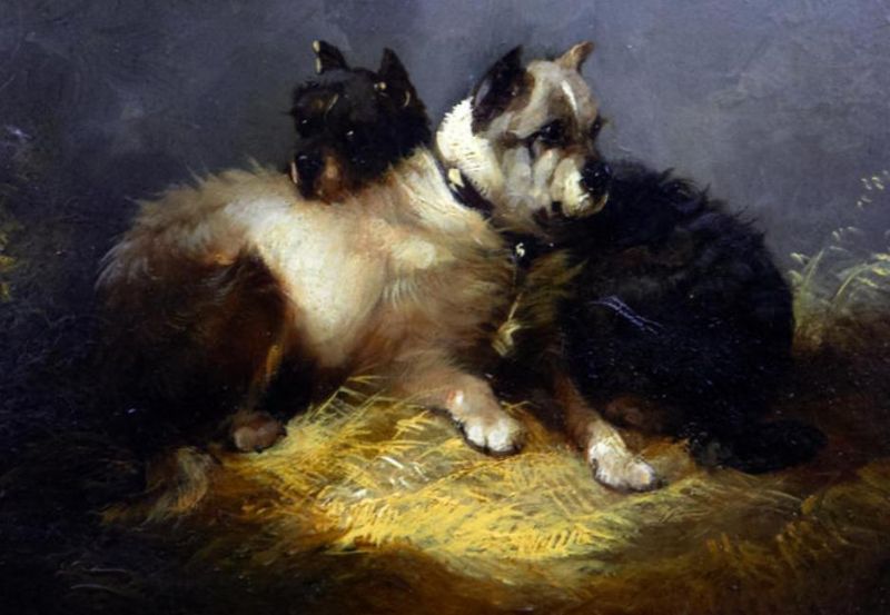 Two terriers seated on straw
