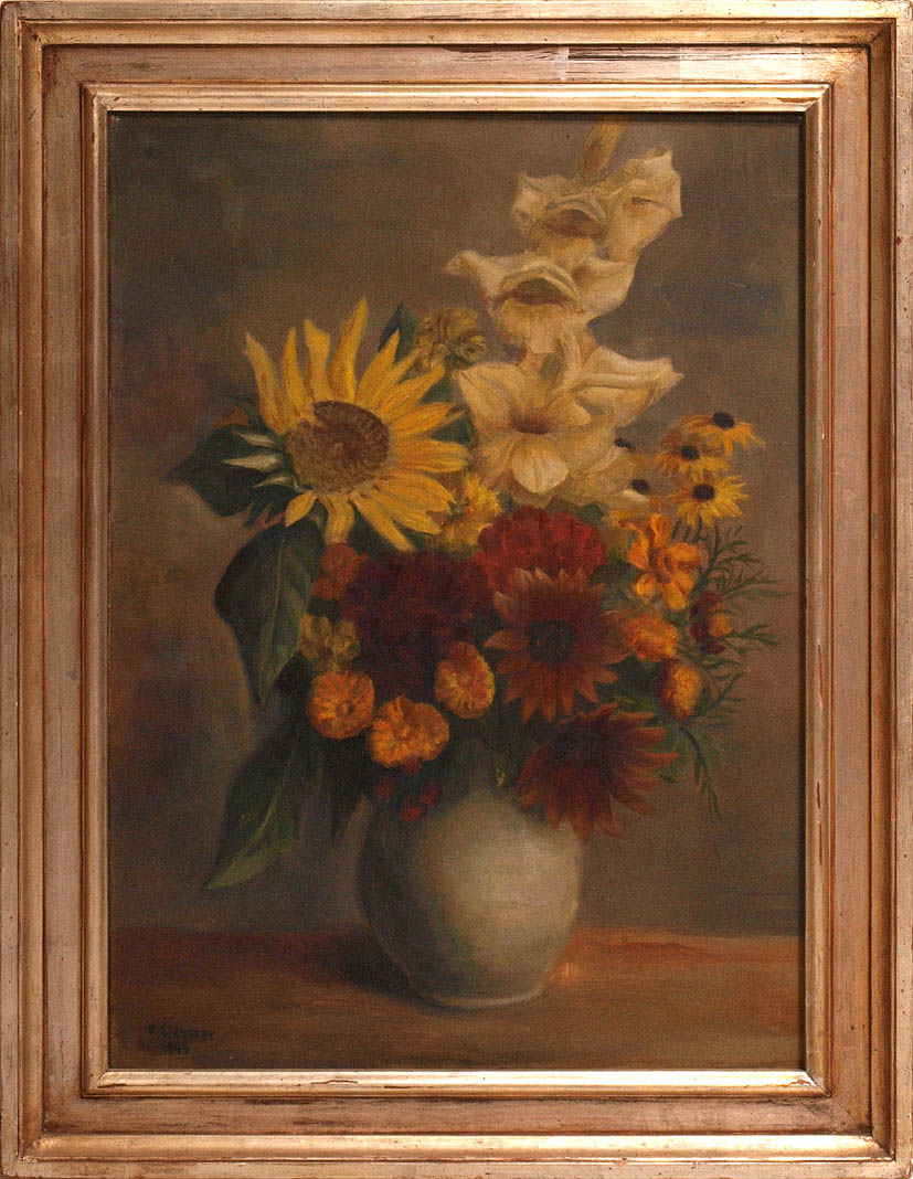 Farbenfroher Gartenblumenstrauß in salzglasierter Keramikvase vor changierendem Hintergrund