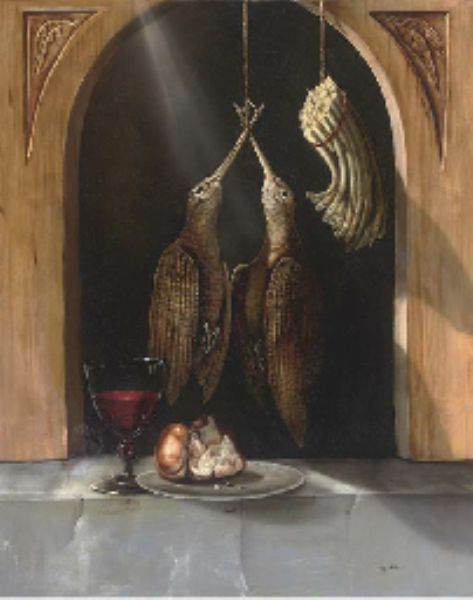 | A brace of woodcock, asparagus, a glass of wine, with bread on a platter, in an alcove | |