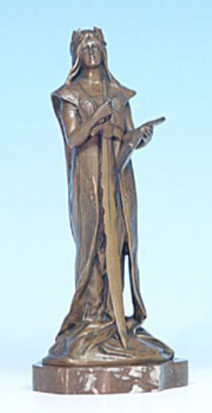 | Weibliche Figur mit Lorbeerkranz im Haar, Schwert und Buch in den Händen haltend. | |