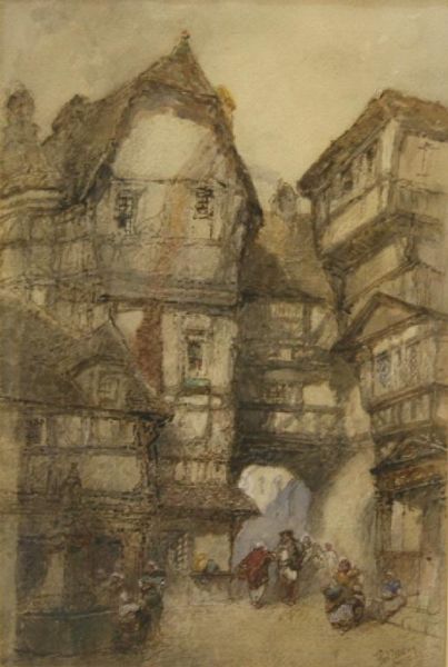 | A CONTINENTAL STREET SCENE with figures amongst congested buildings and archway | |