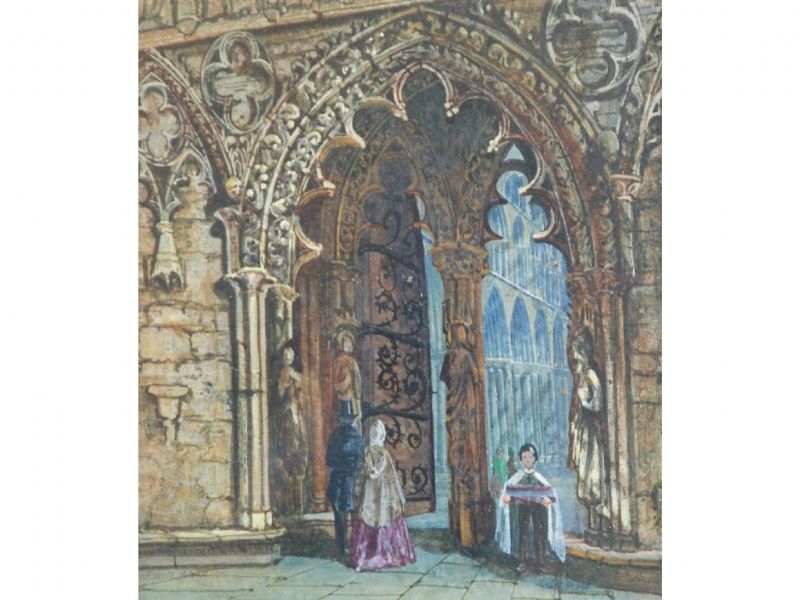 Church interior with figures beneath an archway