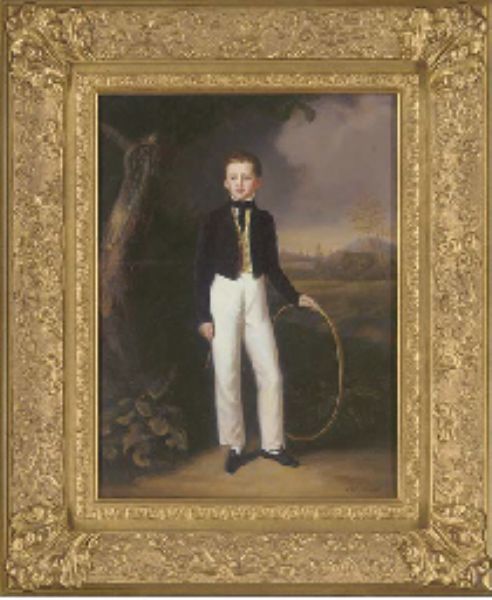 Portrait of a boy, full-length, holding a hoop, in an extensive landscape