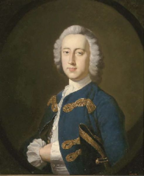 Portrait of a gentleman, half-length, in a blue coat holding a black bicorn, in a feigned oval