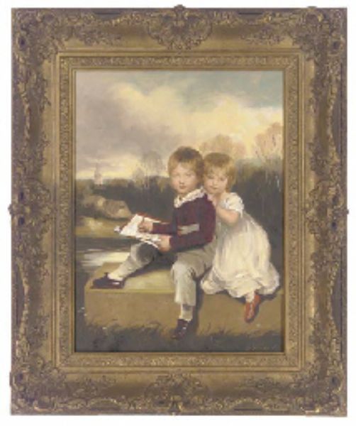 Portrait of a young boy and girl, small full-length, the boy holding a pencil and paper, both beside a river, a spire beyond
