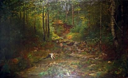 HOMME SE DÉSALTÉRANT DANS UN SOUS-BOIS