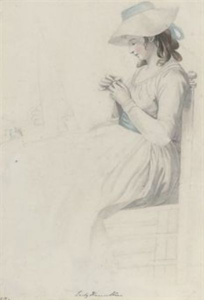 | Portrait of Lady Emma Hamilton, seated in a white dress with a blue sash, a landscape with sheep beyond | |