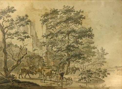 | A ruin near a river with figures, cows and sheep in the foreground; with two other landscape | |