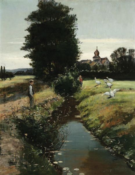 Gänsehütende Knaben am Bachlauf.