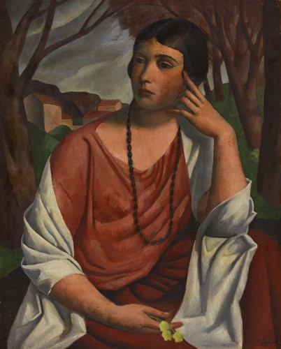 | Porträt einer nachdenklichen Dame vor Landschaft. | |