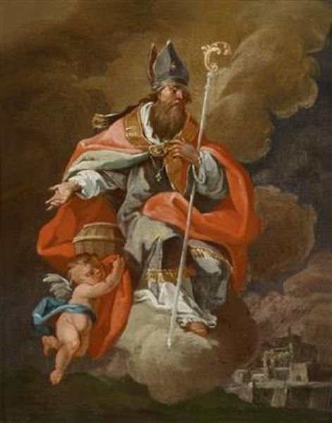 | Saint Rupert and an angel with a bucket of salt, the saint’s attribute, hovering over Salzburg | |