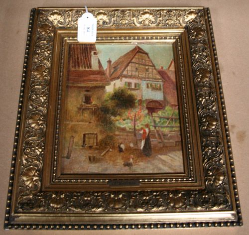 'Bauernhauser' (Girl and Chickens outside a Farmhouse),