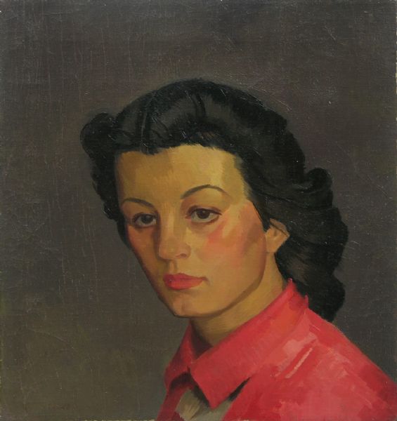 Head of a woman in a red shirt