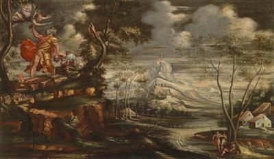 | A pair of landscapes with Biblical groups (The sacrifice of Isaac and Jacob and the burning bush) | |