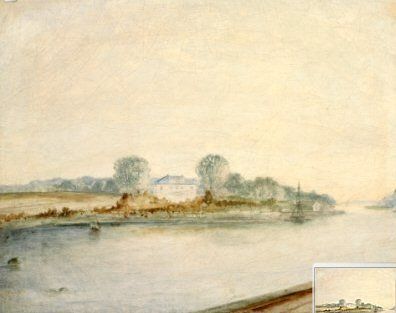 Landskap med vann og bebyggelse