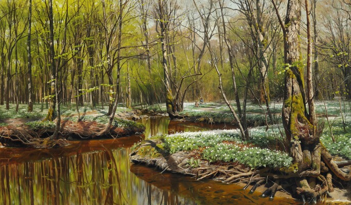 | A spring day in the forest with beech trees along a stream | |
