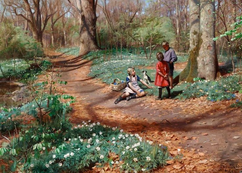 | Kids picking anemones and violets in a forest with unfolding beeches | |