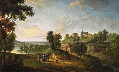 WIDE RIVER LANDSCAPE WITH VILLAGE AND FIGURES