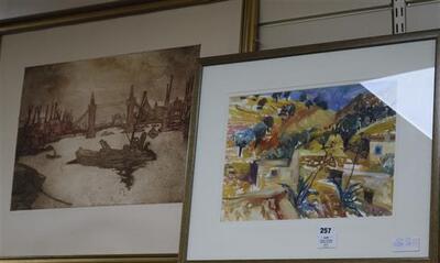 Spain in September, and a signed etching and aquatint, titled "Tower Bridge"