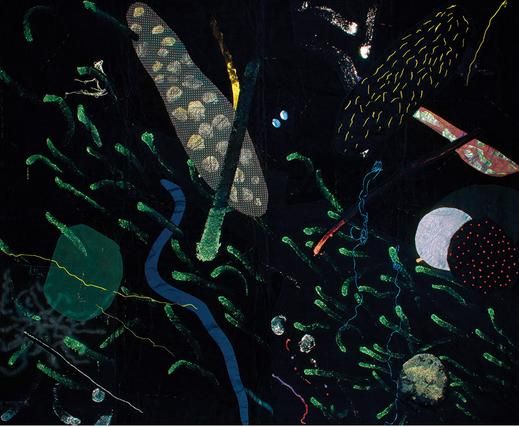 Acrylic fabric, glitter and collage on velvet