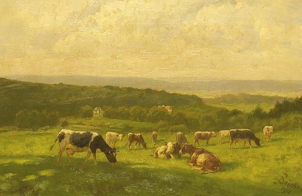 | Weidende Kühe, im Hintergrund Mittelgebirgslandschaft in der Dämmerung | |