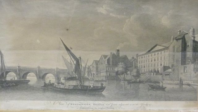 An Engraving titled A View of Westminster Bridge with parts adjacent as in the year