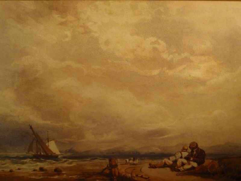 | Figures seated by the sea, fishing boats in a choppy sea | |