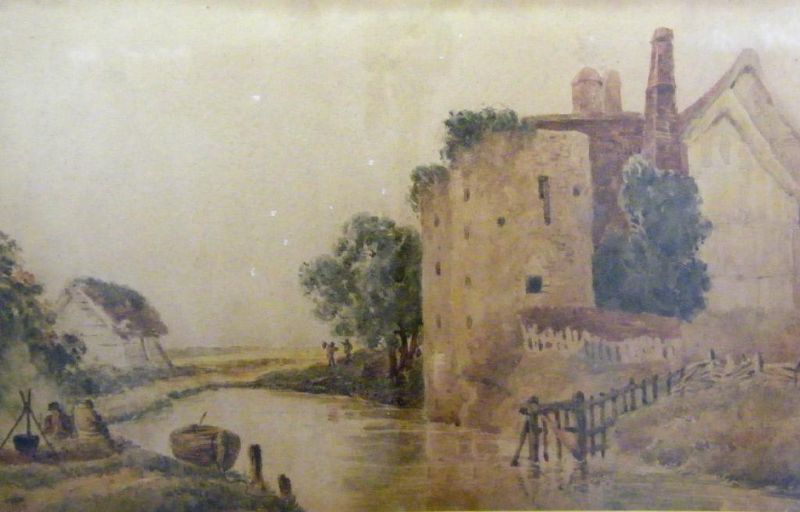 river scene with a house and figures by a fire