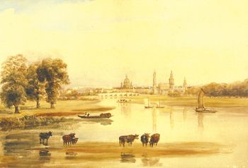 | Cattle grazing by the river Elbe, a view of Dresden beyond | |
