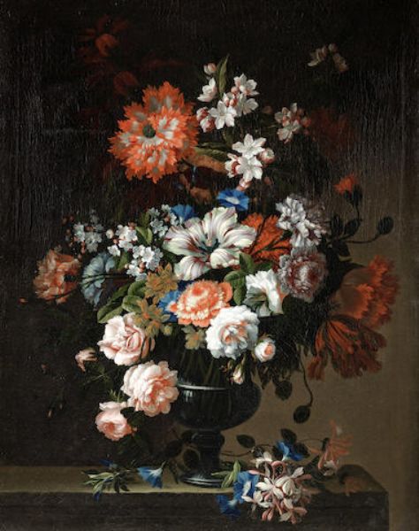 | Roses, tulips, carnations and other flowers in a glass vase, with honeysuckle and morning glory on a stone ledge | |