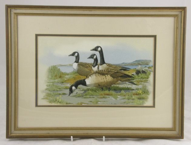 A gaggle of four Canada geese in habitat with daffodils in the foreground