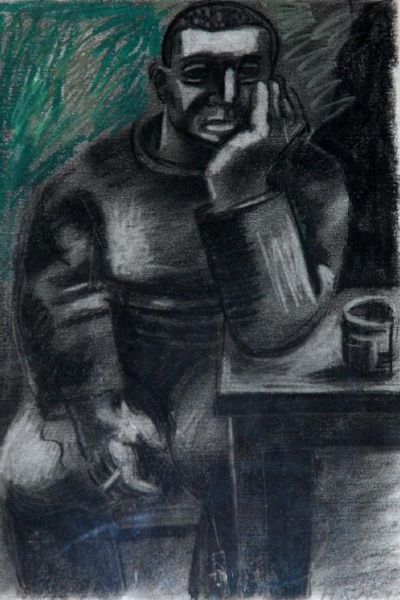 FIGURE SEATED SMOKING AND RESTING ON A TABLE