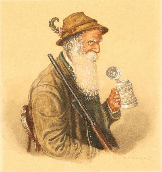 Weißbärtiger Jäger mit Bierseidel. Im Profil.