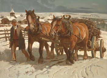 Farmer and horse carriage in the snow