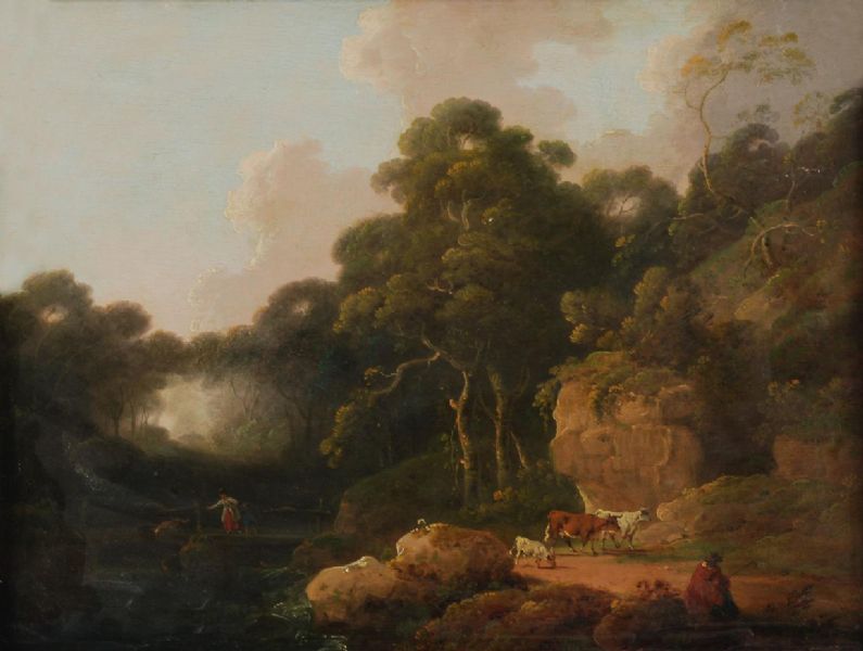 A wooded river landscape with a drover and his cattle