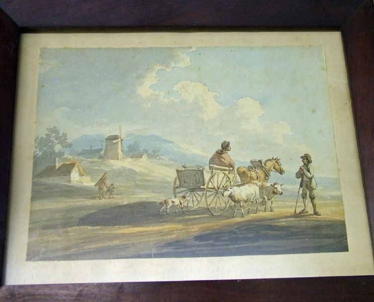 | Lady on horse and cart on a country lane talking to a shepherd with two sheep and his dog, a windmill in the distance | |