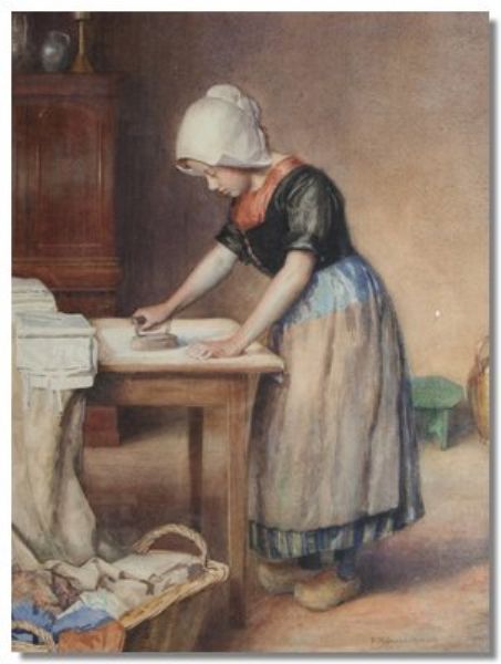 Interior scene with a girl ironing clothes at a table