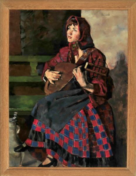 Sitzende Frau in Tracht spielt verträumt Gitarre