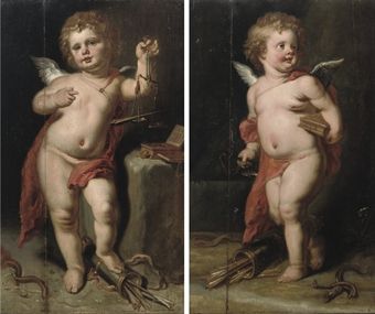 Allegories of Love: Cupid weighing love and money; and Cupid carrying a money box and scales