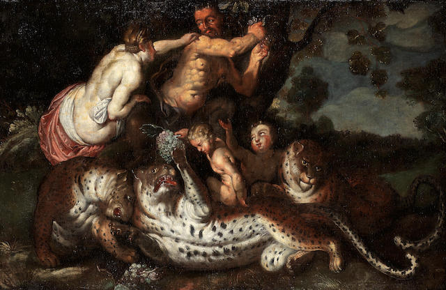 Leopards with a satyr, nymph and putti
