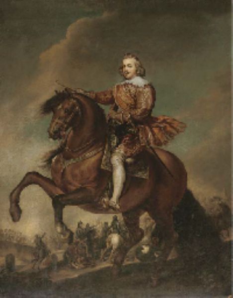 Portrait of Philip IV, on horseback, a cavalry skirmish beyond