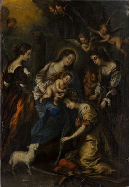 | Maria und der Jesusknabe bekränzen die Heilige Agnes, Katharina von Alexandrien und Margareta von Antiochien | |