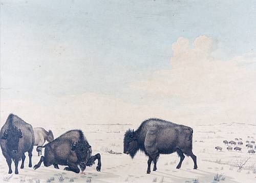 Indian hunter shooting at bison herd
