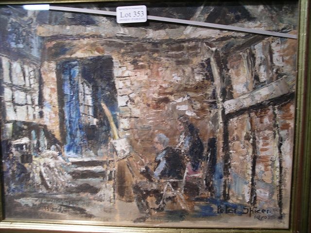 | The Artist Studio, with artist at the easel and another figure looking over his shoulder, Pallet Knife on hardboard | |