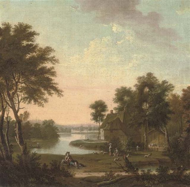| A wooded river landscape with a shepherd and his flock and a couple by a hamlet | |