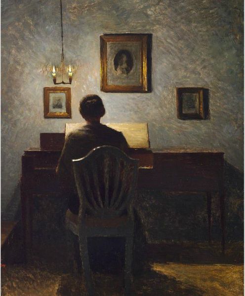 Interior with a lady at a spinet, evening light.