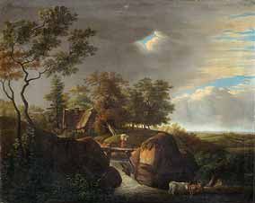 | Landschaft mit Wasserfall und Kühen vor aufziehendem Gewitter | |