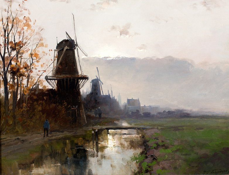 Landschap met molens in de vroege ochtend