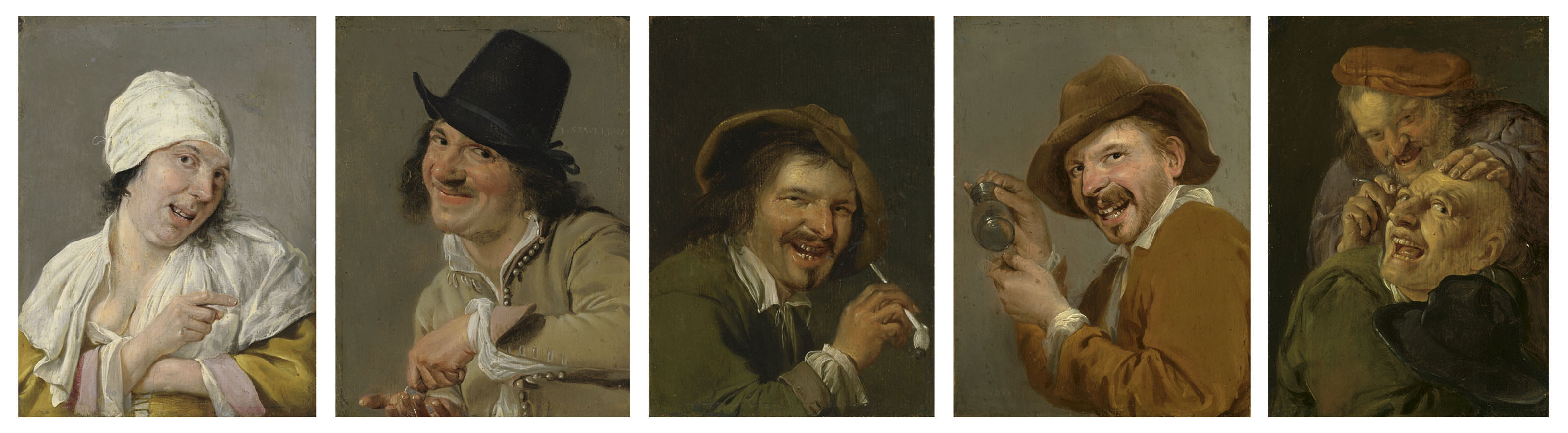 | Personification of the five senses: Sight: A young woman pointing; Hearing: A man counting coins; Smell: A laughing man smoking | |