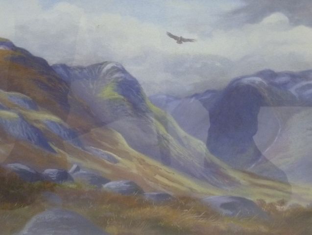 A bird soaring high over mountainous moorland